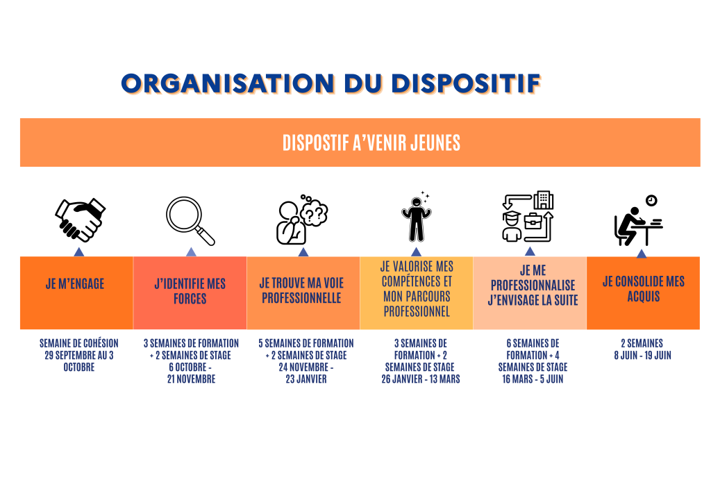 17 semaines de cours (Travail sur les compétences générales, découverte des métiers, travail sur les compétences transversales/psychosociales)